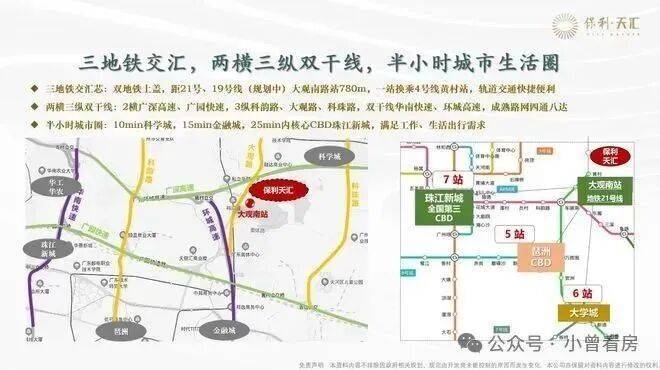 地铁方面,项目距离地铁21号线大观南路站约1.2公里,步行约20分钟,可1站换乘4号线,直达金融城、琶洲,4站到员村换乘5号线,快速接驳珠江新城。另外,未来规划中的19号线、37号线或将交汇于此,但落地尚需时日,因此短期内公共交通的便利性仍有不足。
