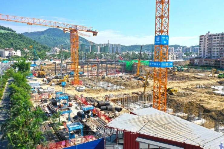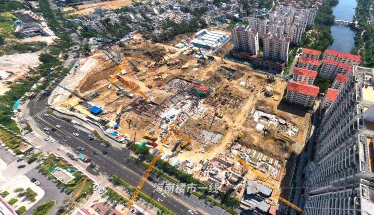 项目工地内,一派热火朝天的开干状态,有挖土机、吊臂、打桩机等重工机械,还有不少工人在作业。