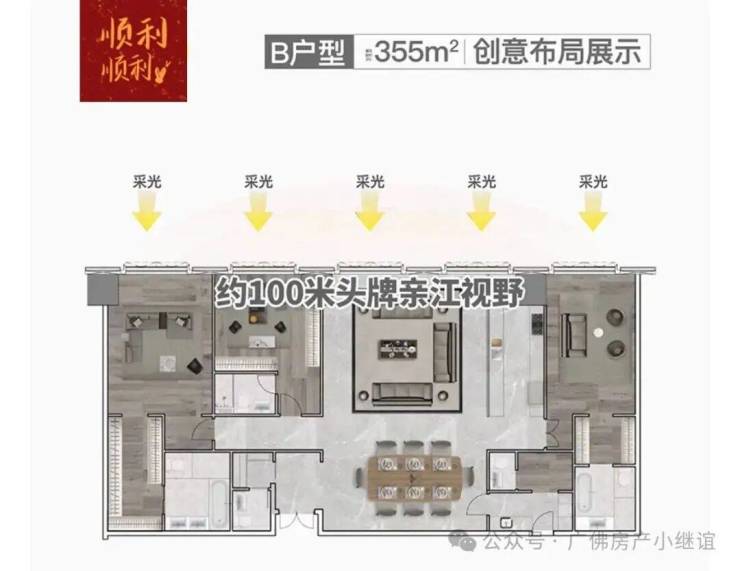 建面约355㎡户型,板式方正格局,一体化双厅,收揽一线江景与繁华。