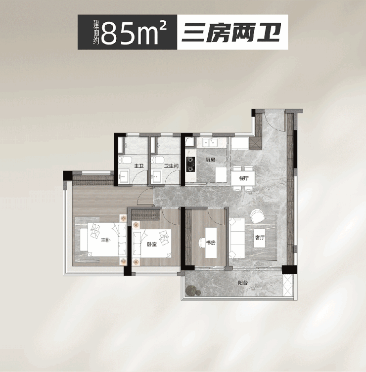 建面约85平三房两卫,带6米大阳台,85平,同样超越市场一个版本。