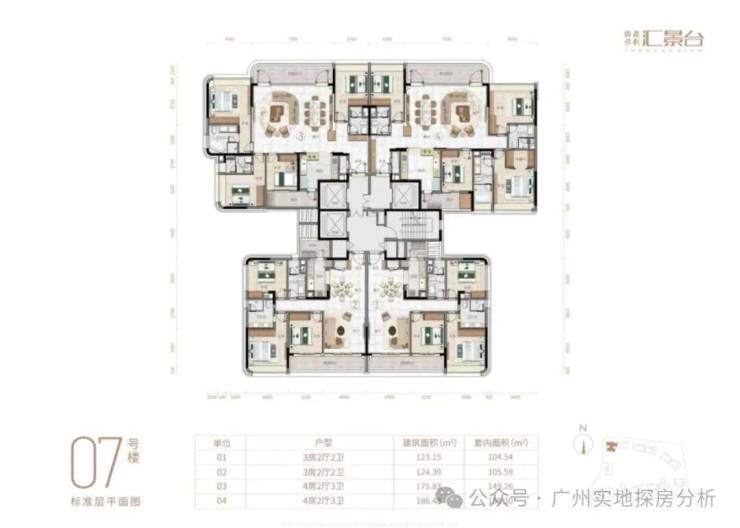 项目由14栋12层小高层组成,涵盖123-352㎡三至五房,共8类户型。