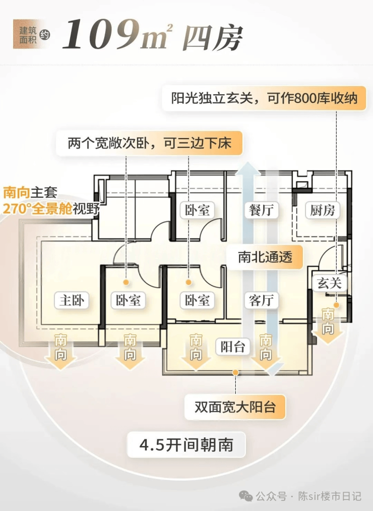 建面约109㎡四房,南北对流设计,通风采光更好。