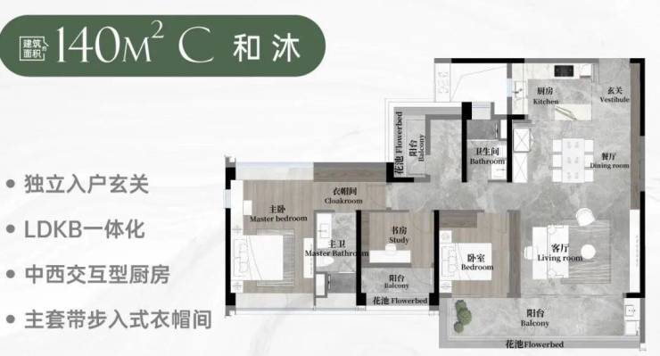 140平方和沐:(3+1)室2厅2卫,入户玄关+超大阳台+双套间
