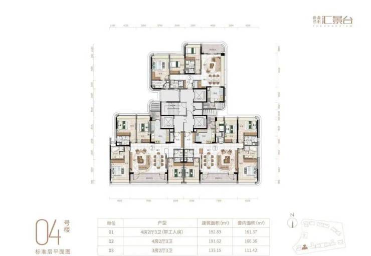项目由14栋12层小高层组成,产品涵盖123-352㎡三至五房,共8类户型,户型实用率约82-84%