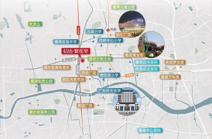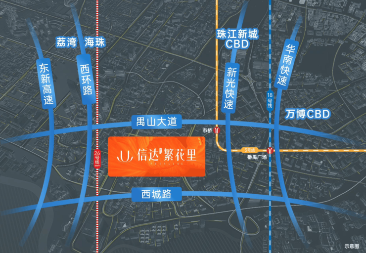 信达·繁花里位于广州市番禺区市桥街道禺山大道371号,广州地铁3号线市桥站1.5公里左右;市桥是番禺的核心区域,汇集了包括区政府、政务中心、海关、税务局等番禺重要的行政部门,同时汇聚多个文化地标,湾区未来的“流量入口”。