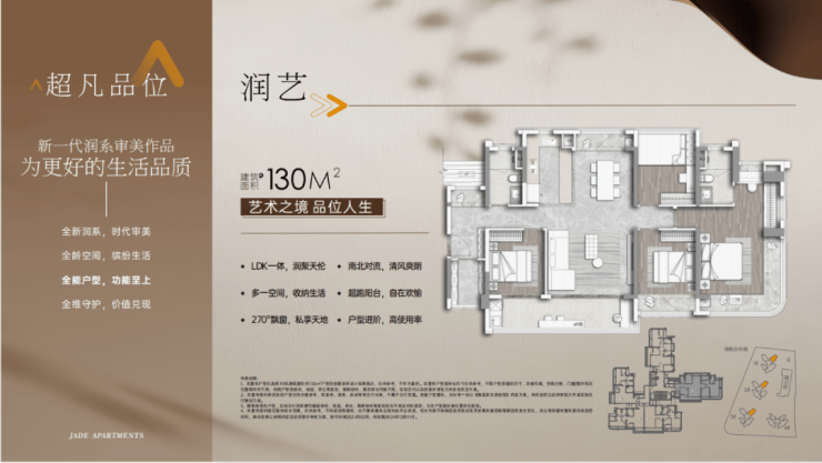 建面130平四房两卫,入户即见对景式玄关,可做景观装饰,也可做玄关柜收纳,该户型LDKB一体化设计,客厅开间超4米,可打通客厅旁的次卧做成7.2米大方厅,主卧配270度全景舱,可双面屏观景