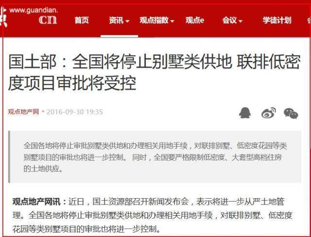 2016年,国土资源部召开新闻发布会,将进一步从严土地管理,控制对联排别墅、低密度花园等类别墅项目的审批。
