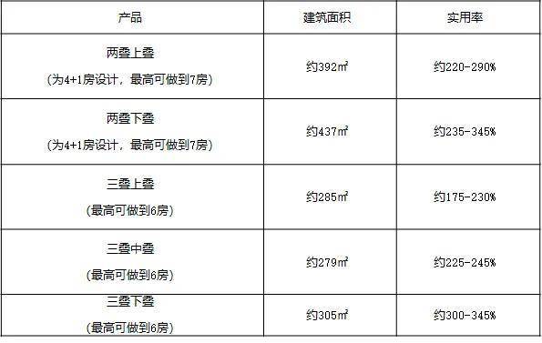 ●产品户型:两叠(上叠 约392 ㎡、下叠约 437 ㎡),三叠(上叠约 285 ㎡、中叠 约279㎡、下叠 约305 ㎡)