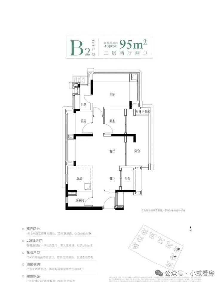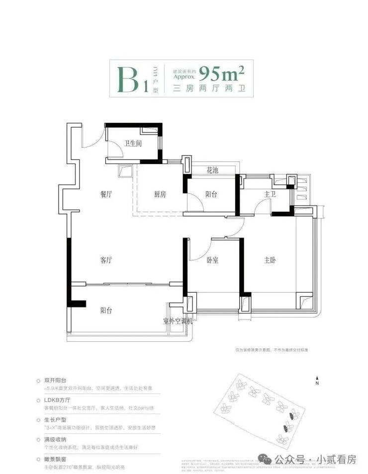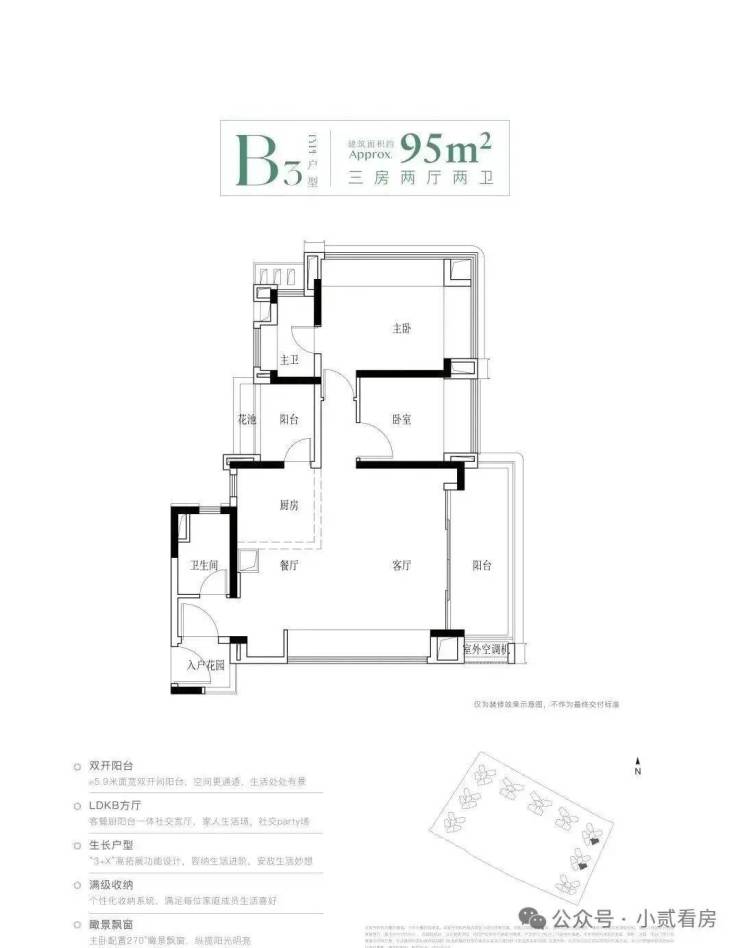 建面95平三房,该户型有四个不同的户型,都是竖厅和横厅设计,还有南北对流的户型,主要分布于2、3栋,靠近里面没有什么噪音影响。