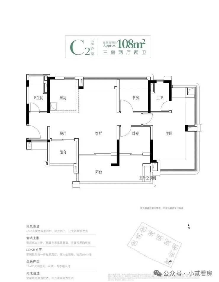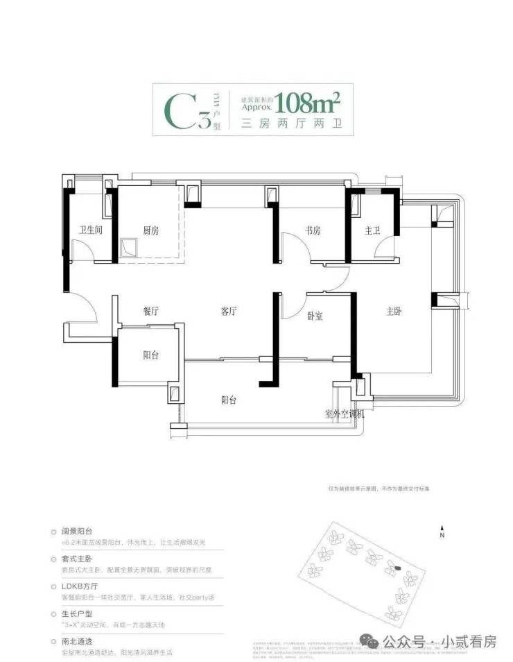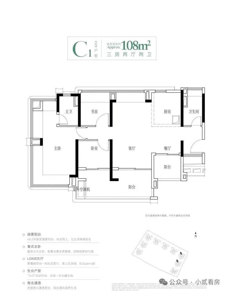建面108平四房,该户型有三个面积段,都做到了南北对流设计,主要分布于1、2、4栋,1栋的108平会被前面的95方挡住一点视野,具体详细情况可以添加微信咨询了解。
