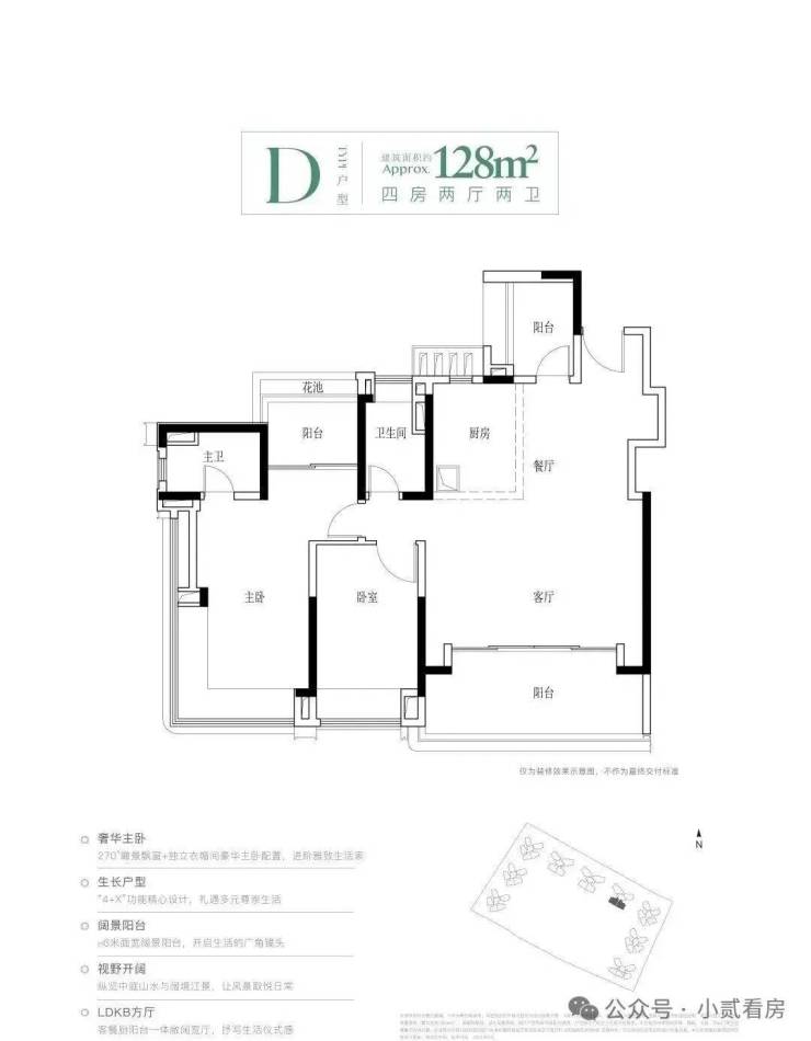建面128平四房,目前首开楼栋只有4栋有,竖厅设计,位于组团中心位置可以看到小区园林以及江景,还有6米的宽景阳台。