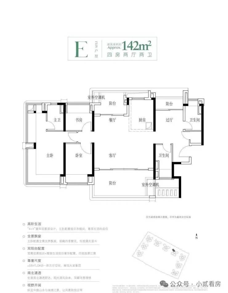 建面142平四房,同样是分布在4栋,南北对流双阳台设计,LDKB一体化大方厅,主卧还配建了独立衣帽间,使用面积完全不输160平以上的户型。