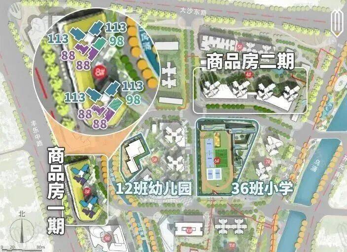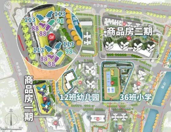 自身配建一所12班幼儿园,一所36班小学,初中依靠周边现有配套。