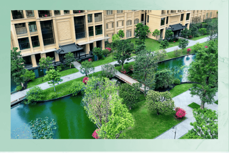 小区园林独具特色,堪称一岛一栋醉美园林。近10000㎡的护城河、泳湖、荷塘三重水系构成园林灵魂,水木亭桥相映成趣,与窗外山景构成山水画卷,诠释古典意境。同时,小区还是名树博物馆,秋枫、荔枝、人面子等名贵树种全冠移植,入住即享绿树成荫。此外,小区坡地设计,首期比市政道路抬高9米,自带豪宅气势;北向望一线香雪公园,南向百米楼距瞰中心水景园林,视野开阔;3.3 - 3.5米奢阔层高,约130 - 265㎡奢阔户型,尽显豪宅尺度。