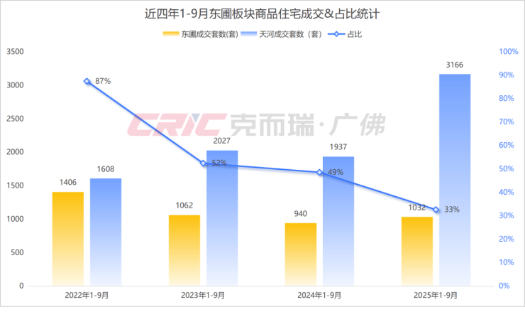 市场表现方面,克而瑞数据监测显示,地块所处的东圃板块今年1-9月商品住宅成交1032套,较去年同时期增长10%,区占率33%。