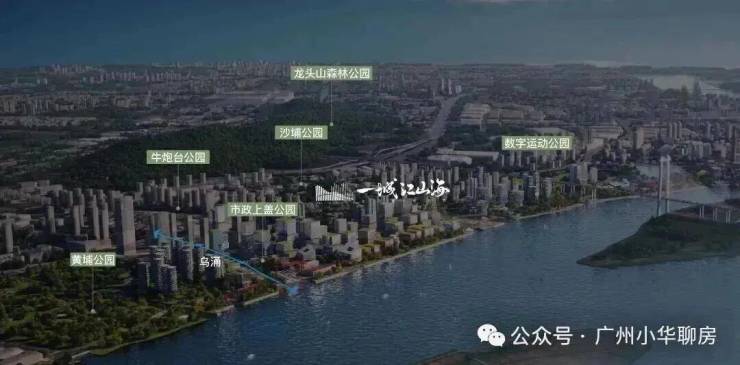 拥揽珠江一线景观、关键还是南向望江,这是连琶洲都做不到,还背靠5000亩龙头山森林公园,南望珠江水,山水相依,所开发地块约90%界面朝向公园,打造 300 米见绿,500 米见园;加上片区规划“5+9”的“公园城市”,一流生态环境实现出门即入园