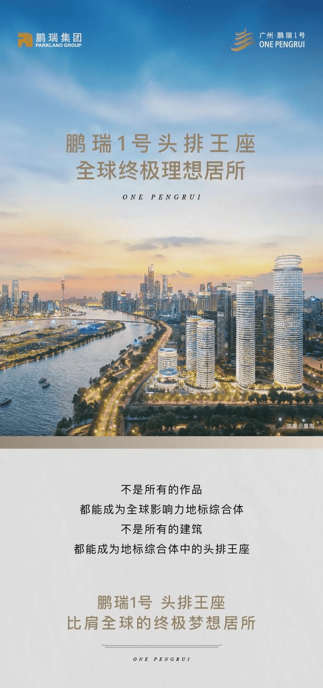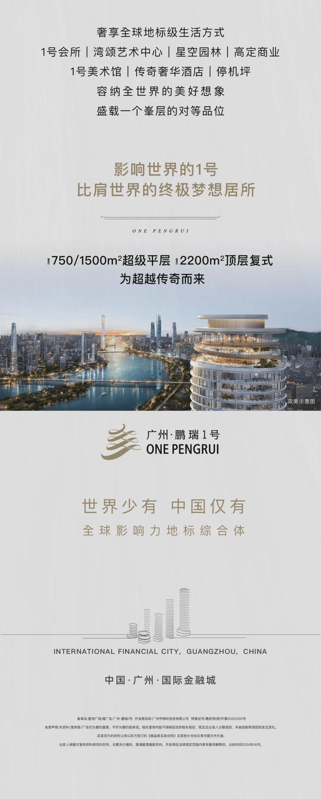广州鹏瑞1号位于广州市天河区黄埔大道东806号,占地约5.42万平方米,建筑面积高达29万平方米。该项目包含6栋高层住宅及公寓、奢华酒店、高端商业区等复合业态,配备环幕天际泳池、艺术展厅等高端设施。其地理位置优越,交通便利,周边教育资源丰富,已成为广州乃至大湾区的豪宅标杆。
