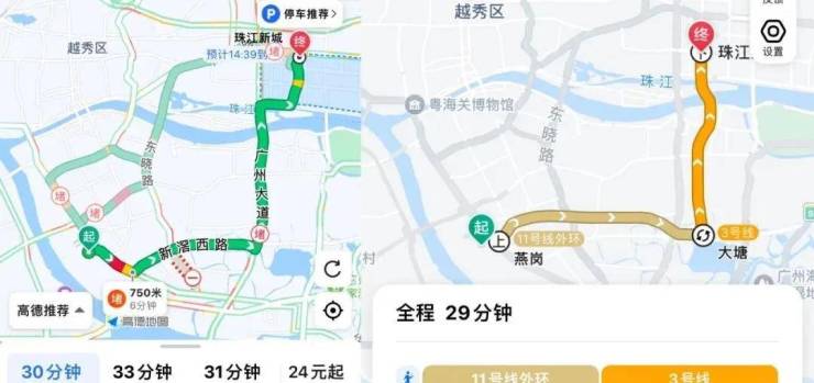 如果是去珠江新城的话,开车大概12公里,花费30分钟左右即可抵达,坐地铁的话,11号线转3号线,全程8个站,耗时29分钟左右。