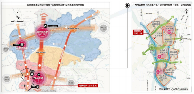 项⽬距离⽩云站约 3 公⾥Ì享受枢纽带来的⾼铁 + 城际 + 地铁多维交通(1 ⼩时直达深圳、佛⼭、东莞,融⼊湾区 1 ⼩时⽣活圈),快捷的交通也将带领板块产业腾⻜。