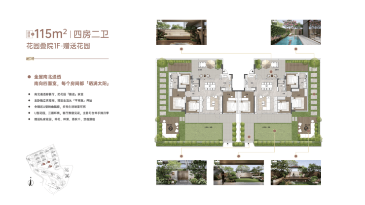 ·超⾼赠送空间:⼀层享环绕式私家花园,⼆⾄四层分别配置专属露台 / 天⾯空间,拓展⽣活场景(如茶室、阳光房、空中花园);