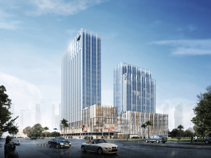 项目由两栋国际理念建筑,三层下沉式公园购物广场组成。