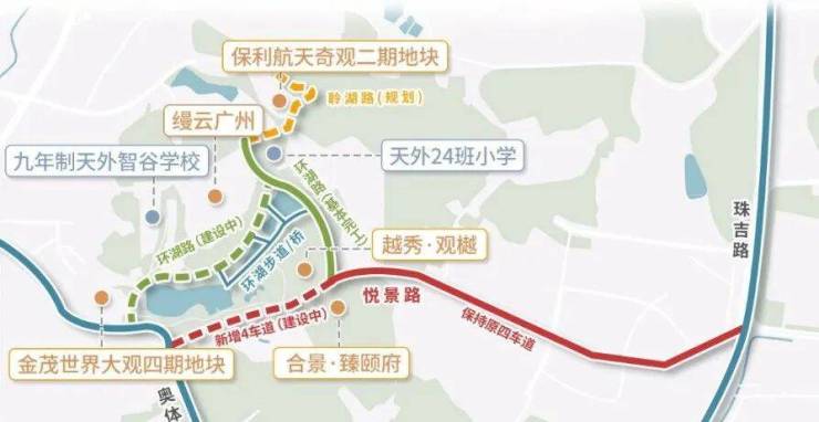 奥体路已通车,悦景路修好待开通,距离最近的21号线大观路地铁站大概1.7km,内部还设立公交总站直达地铁21号线。通过21号线大观路站,通勤珠金琶非常方便,21号线3站地铁直达天河公园,然后转成11号线通达广州“内环”;也可以21号线做1站到黄村站转4号线通勤金融城和琶洲也非常便捷;