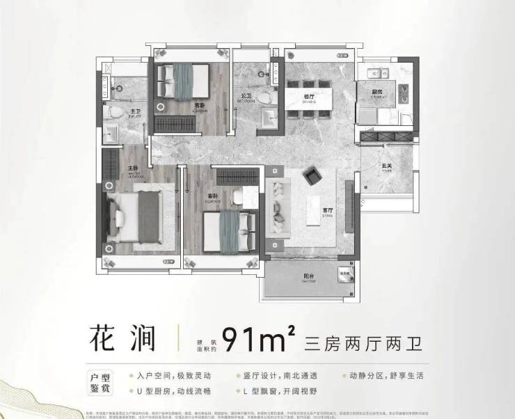 比如91平的四开间朝南+U型厨房;106平三房及四房都有大阳台,整体采光和实用空间都算出色。