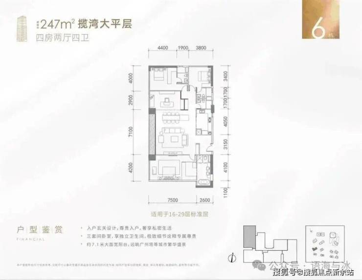 产品方面,项目提供多样化高端住宅配置,满足不同层级的生活需求。叠墅产品位于7栋与10栋,面积区间240-310㎡,为城市中轴线上罕有的南向首排一线江景叠墅,空间层次丰富,居住私密性强;大平层分布于6栋高区至低区,面积段覆盖79-400㎡,其中高区单位具备270°观景视野,尽揽珠江壮阔与小蛮腰天际;中低区单位则打造实用型江景住宅,面宽设计极致优化,5开间朝南,13米以上阳台面宽,营造超阔观江视界。loft公寓位于5栋,面积段为41-110㎡,买一层送一层,精装交付,是市场稀缺的投资型优质产品。另配备写字楼产品,单层面积达1060㎡,整体约4万㎡,匹配城市总部级办公需求,成就金融城商务新地标。