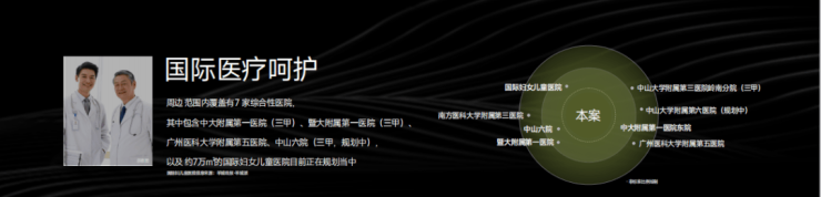 综合医疗资源:周边覆盖7家综合性医院,包括三甲医院中大附属第一医院、暨大附属第一医院等,中山六院及6.9万㎡国际妇女儿童医院(规划中)