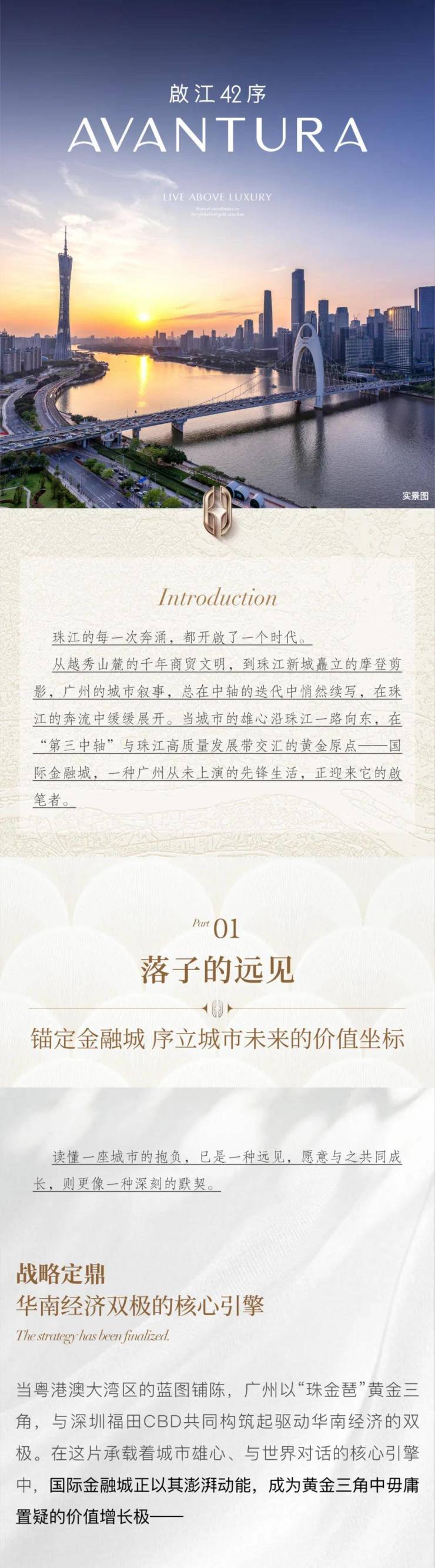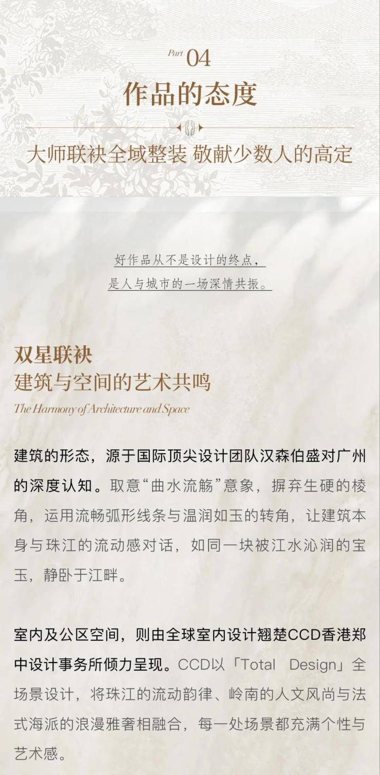 核心理念: 位于广州“珠江至贵一英里”的黄金岸线,定位为全球先锋生活方式的塔尖藏品,仅推出42席稀缺豪宅。