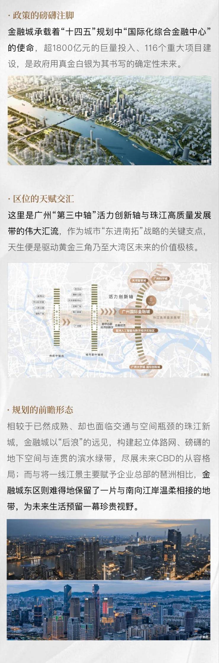 广州新中心: 强调广州城市发展已从传统中轴线、珠江新城,东进至广州国际金融城。这里是“一带一轴”(活力创新轴与珠江高质量发展带)战略的交汇点,是未来十年的城市价值高地。
