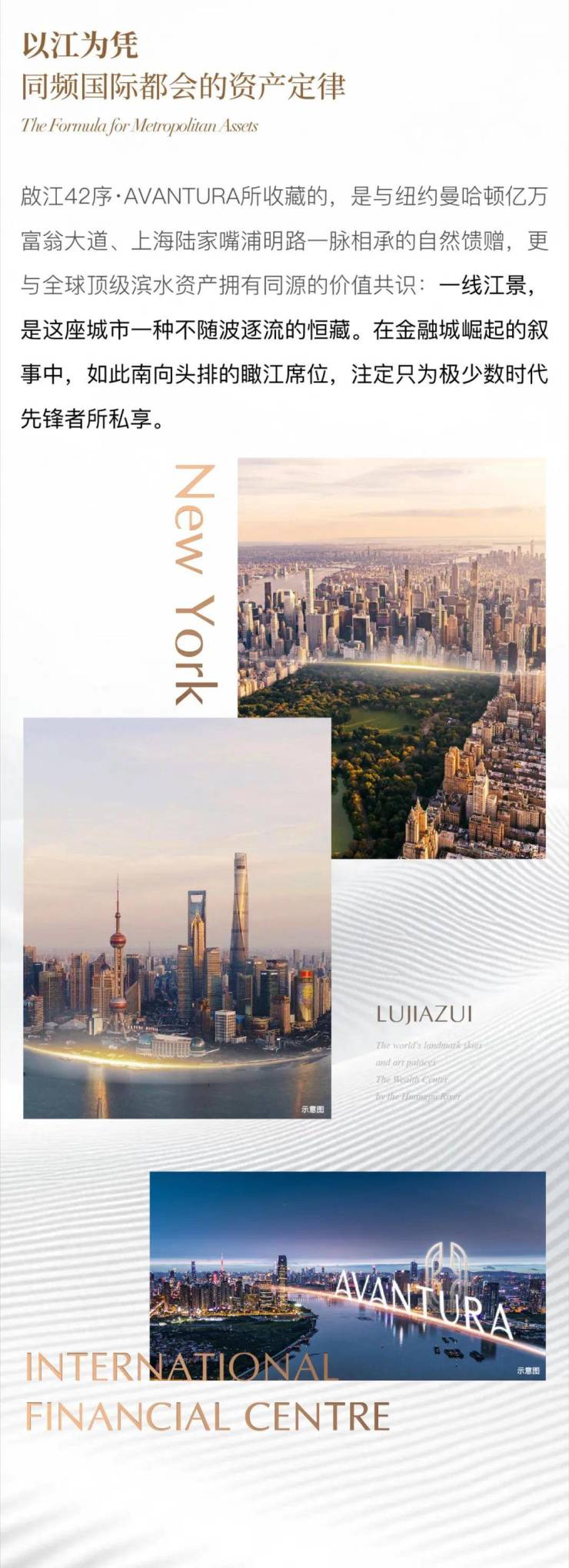 城市金线: 将项目置于与纽约“亿万富翁大道”、上海陆家嘴同等级别的“城市价值金线”上。