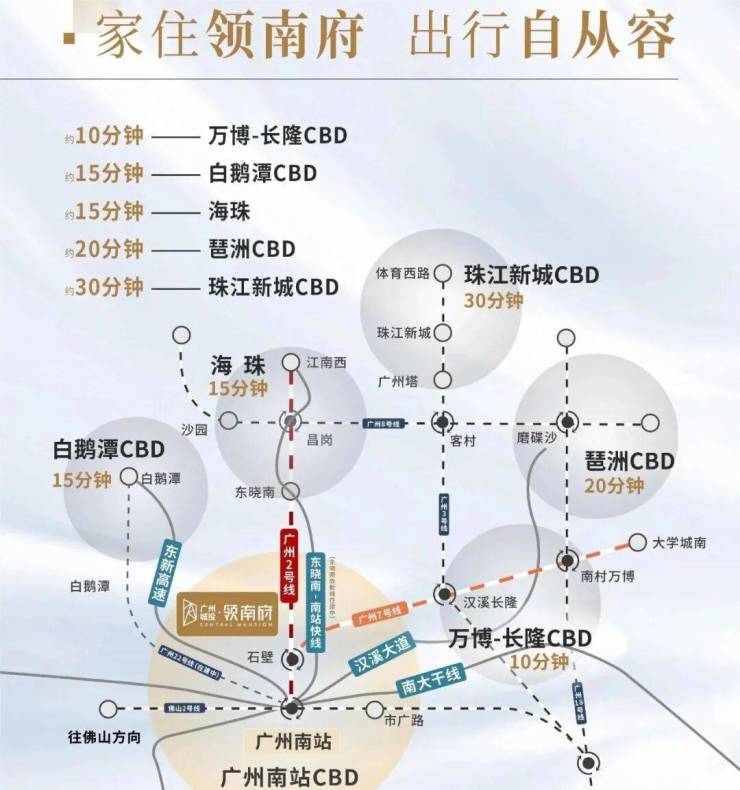 一条汉溪大道,串联南站商圈、江南西商圈、汉溪长隆商圈、珠江新城CBD、琶洲CBD和万博商圈,城市繁华便捷可享。