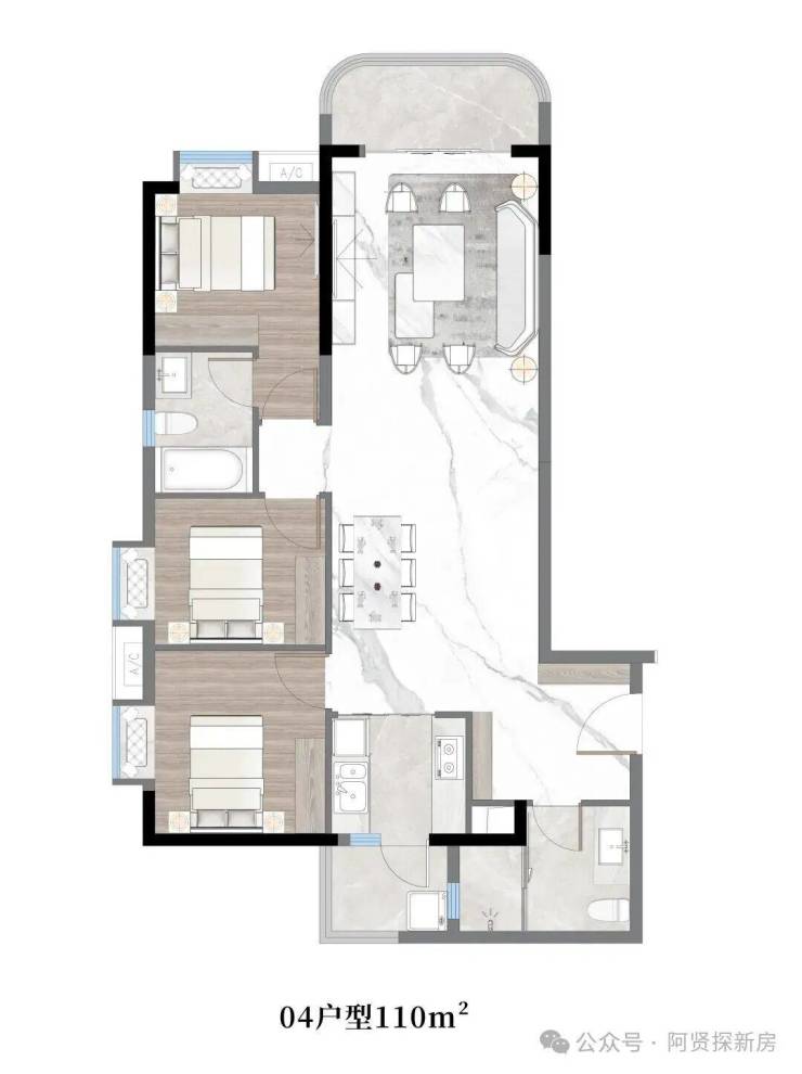 04户型:约110㎡,三房两厅两卫带主套