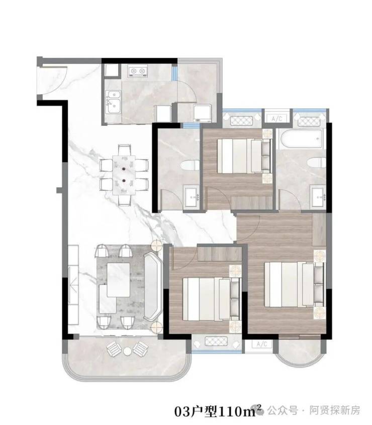 03户型:约110㎡,三房两厅两卫带主套
