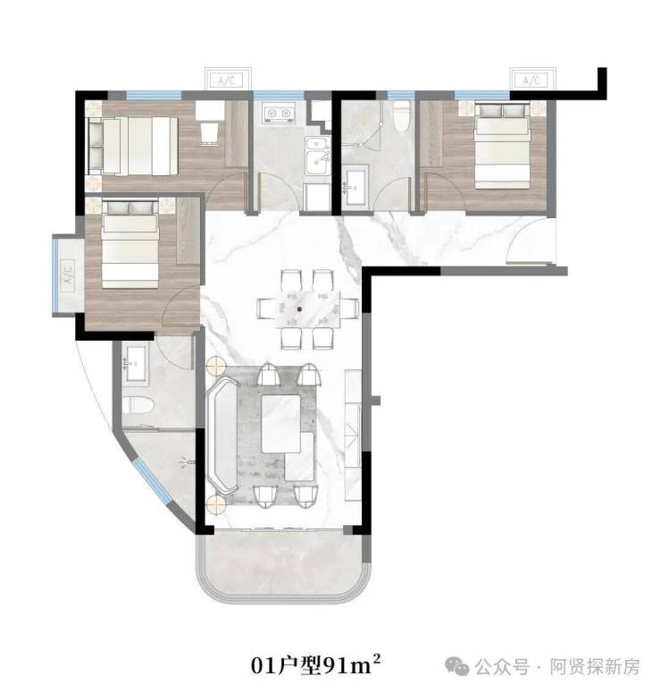01户型:约91㎡,三房两厅两卫带主套