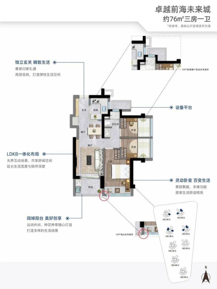 76㎡的3房2厅1卫,设计的是竖厅格局,进门入户玄关,客厅3.05米开间,LDKB一体化,S墙设计预留冰箱位,3个卧室分别做到了2.95米/2.3米/2.15米的宽度,U型厨房,卫生间三段式分离,还带1个设备平台可以使用,得房率约:89%(包含赠送),阳台有朝东北、东南或西南向