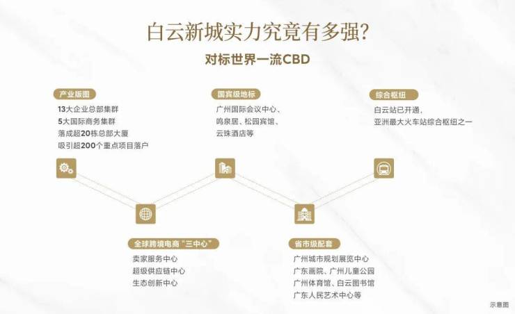 广州新一代CBD白云新城CBD,定位为国际交往中心、总部经济集聚区和云山西麓宜居新城,突破了传统CBD单一产业功能的局限,成为粤港澳大湾区唯一集空港经济、跨境贸易、科技创新、总部集聚于一体的综合性经济中枢。