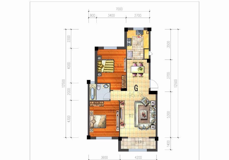 2室2厅1卫-G户型二室二厅一卫一厨