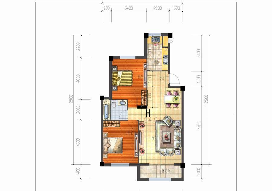 2室2厅1卫-H户型二室二厅一卫一厨