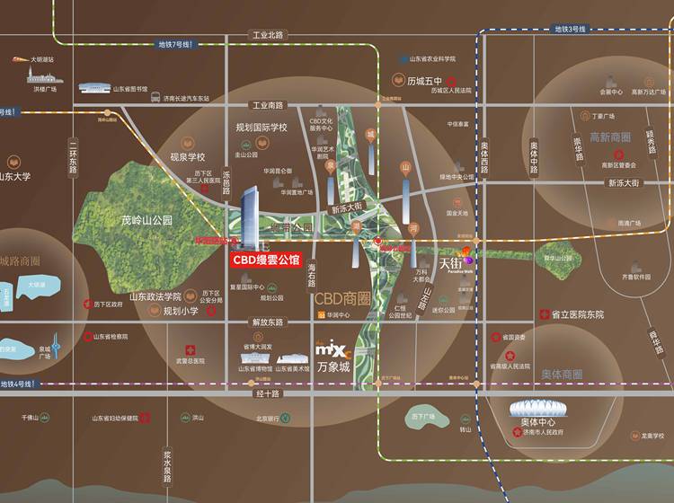 周边商业聚集,紧邻万象城、龙湖济南奥体天街、国金天地、华润置地广场、齐鲁大都荟、省博大润发等。
