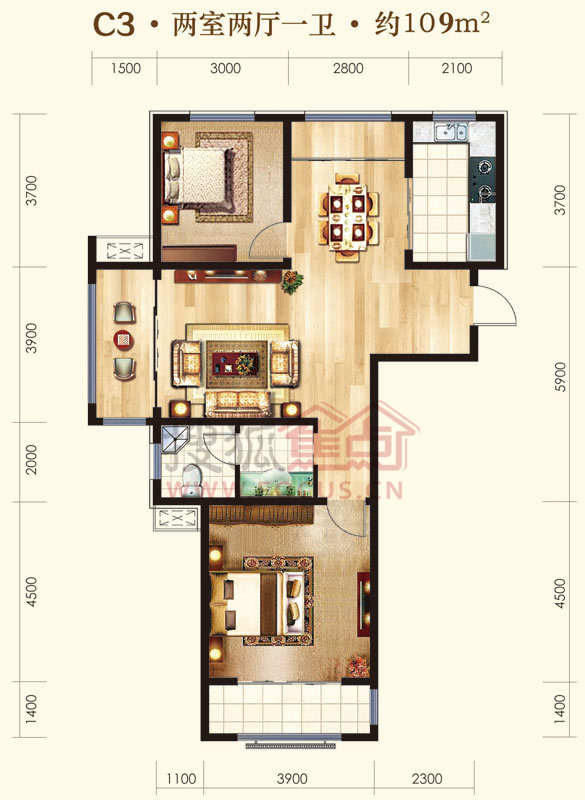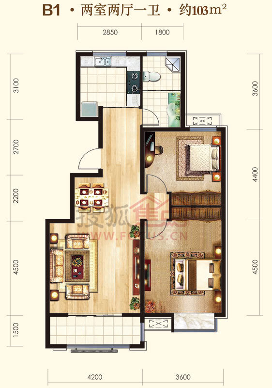 2室2厅1卫-103㎡2室2厅1卫B1户型