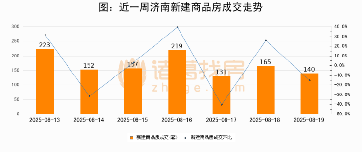 根据济南市住房和城乡建设局数据显示,2025年08月19日济南新建商品房成交140套,较昨日减少25套,环比下降15.2%。近一周济南新建商品房日均成交170套。08月19日单日成交140套,低于近一周平均水平17.6%。