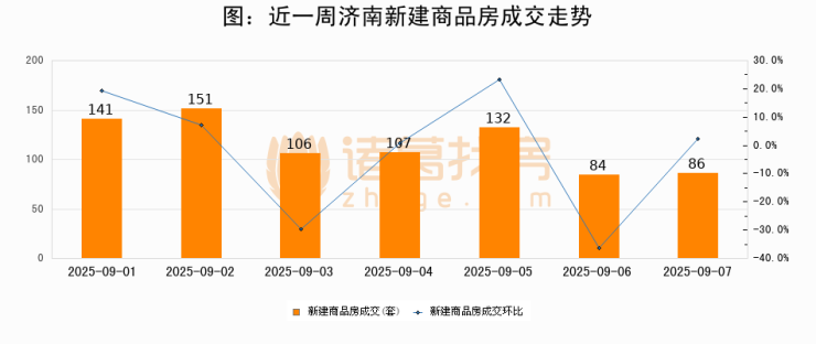 根据济南市住房和城乡建设局数据显示,2025年09月07日济南新建商品房成交86套,较昨日增加2套,环比上涨2.4%。近一周济南新建商品房日均成交116套。09月07日单日成交86套,低于近一周平均水平25.9%。