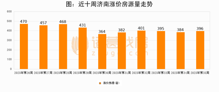 从调价房源来看,第35周济南涨价房源396套,较上周上涨3.1%。与此同时,35周涨价房源占比提升0.48个百分点,业主信心持续恢复。