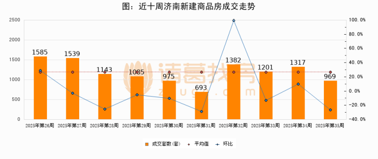 进入2025年第35周(08月25日-08月31日),济南新建商品房成交969套,较上周减少348套,环比下降26.4%。从近十周成交来看,周均成交套数为1188套,本周成交969套,低于近十周平均成交量18.4%。