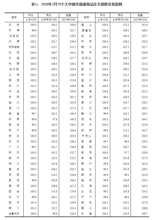 表1: 2020年3月70个大中城市新建商品住宅销售价格指数