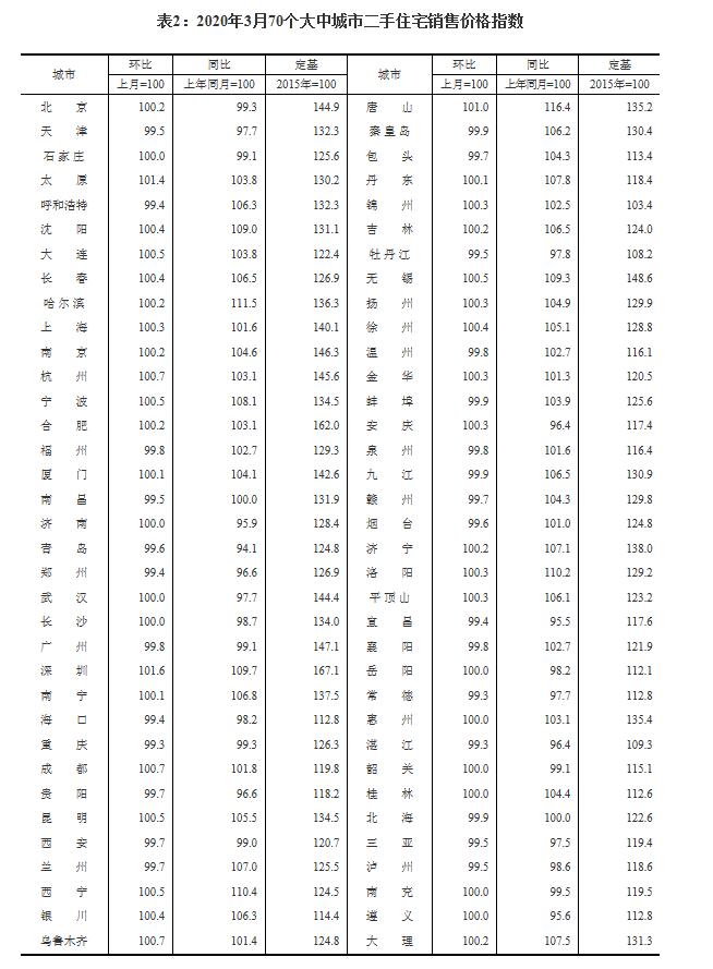 表2:2020年3月70个大中城市二手住宅销售价格指数