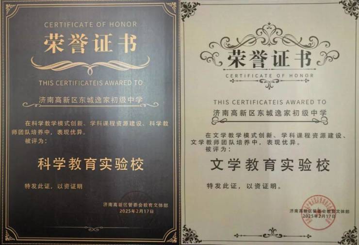 为全面发展济南高新教育,高新区依据“两翼多层”发展性教学评价体系,积极开展文学教育实验校和科学教育实验校的创建工作。东城逸家教育集团三所学校积极申报,经过专家组评审、集体审议,东城逸家中学获评“高新区文学教育实验校”“高新区科学教育实验校”,东城逸家小学获评“高新区文学教育实验校”“高新区科学教育实验校”,奥龙小学获评“高新区文学教育实验校”。