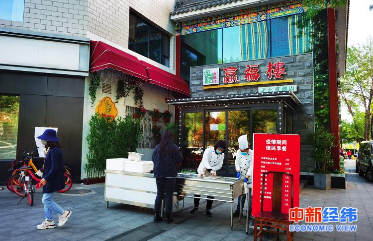 位于国贸商圈附近的一家老北京火锅涮肉酒楼门口,有几位戴着白色厨师帽的人在摊位上忙碌着,旁边树立的海报上面写着“疫情期间便民早餐”。其中,手抓饼加土豆丝7元、油条2.5元,此外还有素包子、糖三角、豆浆、八宝粥等十几种早点,不少路过的上班族纷纷过去购买。